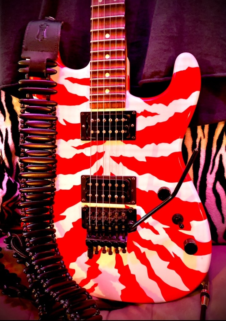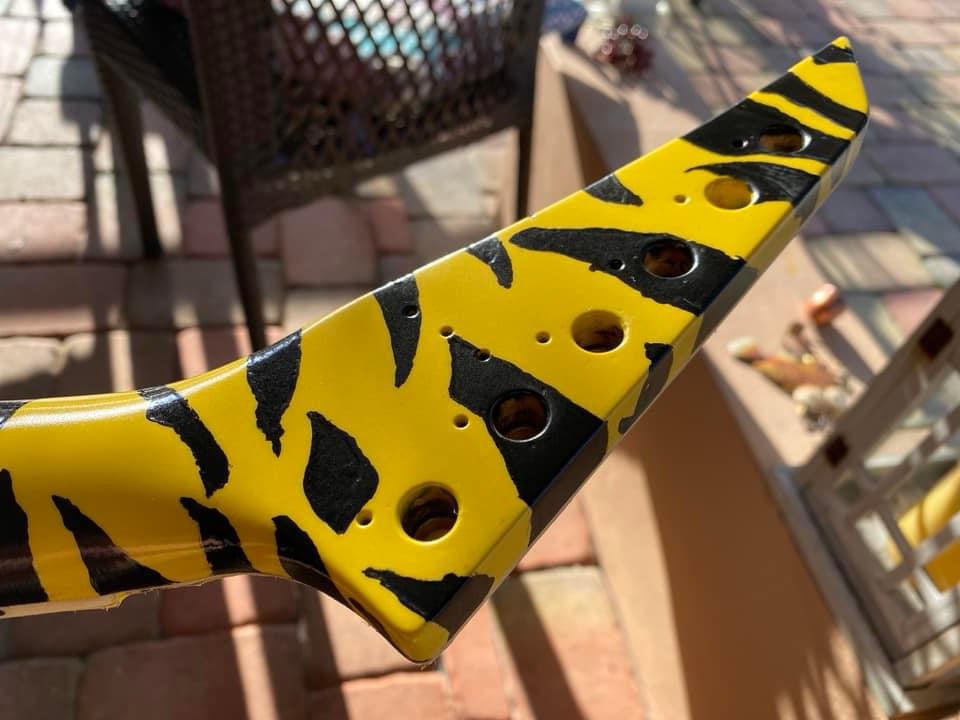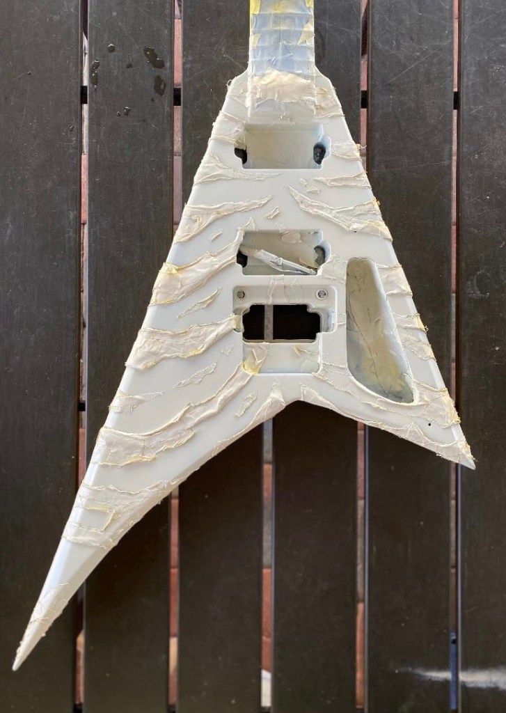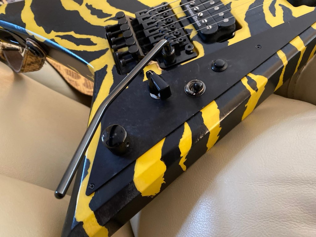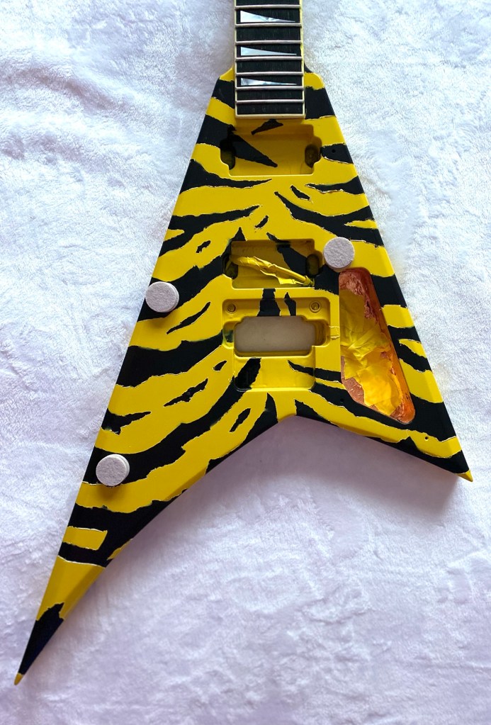 I decided to go ahead with my plans of making it look exactly like the Custom Shop Tiger painted RR V guitar that was featured in the Jackson / Charvel catalog from 1985,
